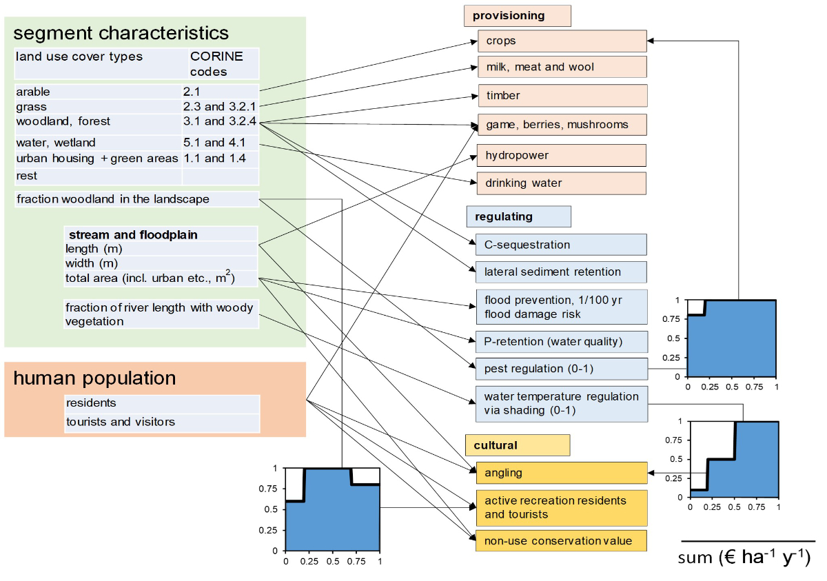 In a first step, knowledge rules for the assessment of each of the 16 ecosystem services were developed, considering all relevant factors influencing the benefit and value provided by a service. For example, the recreational value of angling in mountain rivers depends on the presence of trout, but trout survival depends on shading. Therefore, the following simple rule was derived from literature to assess the effect of woody cover, trout survival and in turn the recreational value of angling: If more than half of the river length is shaded by woody cover, then trout survival is 100%, else survival declines to a residual value of 10% at zero woody cover.