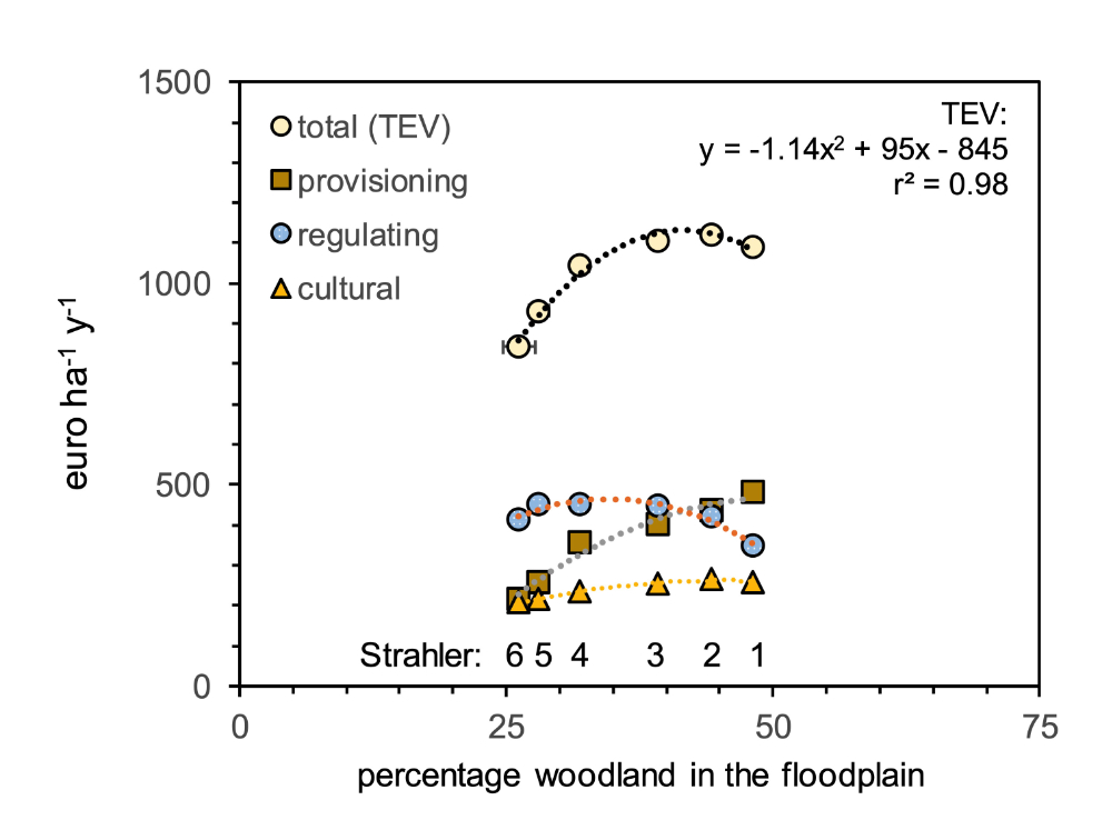 The three different categories of ecosystem services, provisioning, cultural and regulating, however, show different patterns (Fig. 3): provisioning services and cultural services were maximal around 45%, whereas this was around 30% for regulating services. Also, with increasing Strahler order, that is with increasing river size downstream the network, we see that provisioning services decrease (dominated by agriculture, dairy or crops), whereas regulating services (dominated by flood prevention) increase. Together, this apparent trade-off leads to an estimated maximal total economic value (TEV) around 40-50% woodland cover, for stream segments with Strahler order 2. It should be noted that the aggregate values averaged across the four catchments suggest that woodland cover varies between 25 and 50%, whereas the underlying individual segments range substantially wider in woodland cover: from close to zero to up to 100%. This is averaged out by the large number of segments analysed. Still, the four catchments on average have quite some riparian woodland, and that is a noteworthy result in itself.