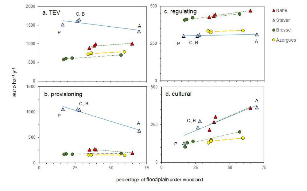 Ecosystem services is a disputed concept and criticized for "comparing apples and pears", "putting a monetary value on mother nature", but also on practical and methodological issues. In OSCAR, we were less interested in the absolute value and used ecosystem services as a framework to compare alternative future scenarios. The variation in woody riparian buffer cover (woody cover) in the floodplain was linked to variation in the provision of different services by the river and its floodplain. More information on general aspects on the use and misuse of the ecosystem services concept and more information on the specific approach used here can be found in Vermaat et al. (submitted) and Vermaat et al. (2020).
