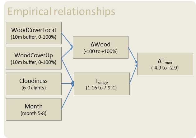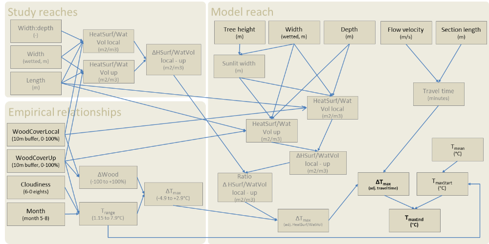 The statistical relationship derived from the empirical study predicts daily maximum water temperature in summer. More precisely, it predicts how water temperature changes along the reach from the upstream start to the downstream end (ΔTmax) due to the change in woody cover in a 10m wide riparian buffer on each side of the river compared to the upstream conditions (ΔWood).