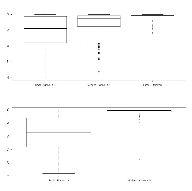 - River size: Shading by woody cover in the 10m buffer reduces the sunlit water surface, and hence, the energy available for heating the water. The BBN adjusts for differences in